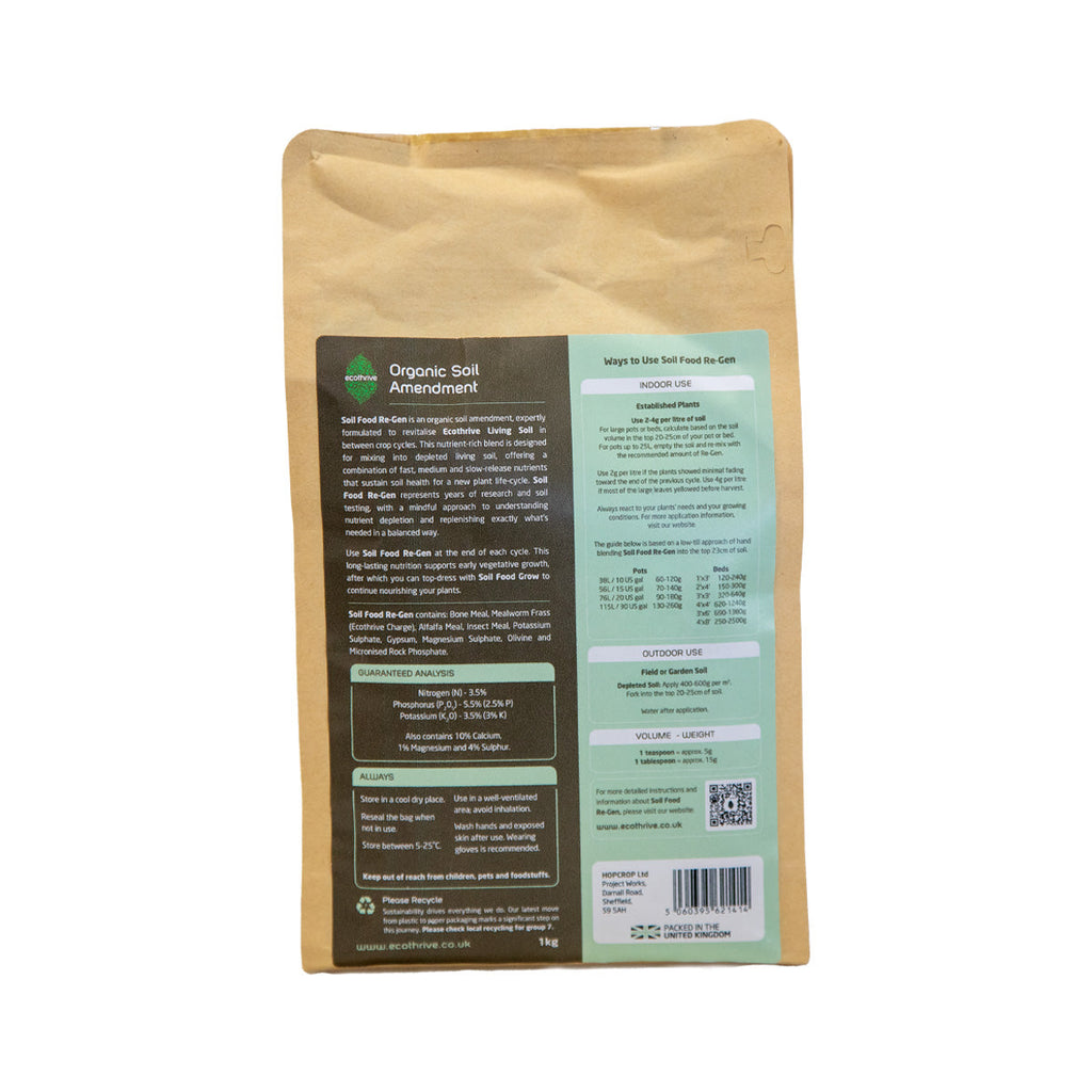 Ecothrive Soil Food gama lurzoru bizidunen hazleentzat diseinatutako lurzoru-ondifikazio sistema organikoa da. Bilduma premium honek Soil Food Grow, Soil Food Bloom eta Soil Food Re-Gen barne hartzen ditu, bakoitza hazkuntza-etapa desberdinetan mantenugai ezinbestekoak emateko formulatua. Landareak elikatzen ari zaren ala ez, loraldia sustatzen ari zaren ala ez, edo lurra hurrengo ziklorako kargatzen ari zaren ala ez, Soil Food-ek hazkuntza organikoa ahaleginik gabe egiten du.